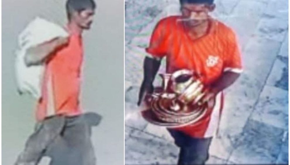 Nizamabad, December 25 (MD Akber- Patriotic Views): In a shocking daylight theft, an unidentified burglar scaled the wall of the Shambhuni Temple located in the Ahmedi Bazaar area of Nizamabad city and decamped with valuable pooja articles. According to details, the thief entered the temple premises by jumping over the wall and stole silver aarti plates, other silver, copper and brass pooja items, a panch dhatu aarti plate, and copper plates before fleeing the spot. The entire sequence was captured clearly on CCTV cameras. The theft came to light when priest Raj Karan arrived, opened the temple doors, and found the pooja materials missing. Following his complaint, 2 Town Sub-Inspector Syed Mujahid visited the scene of offence and examined surrounding CCTV footage, which showed the thief entering, committing the theft, and escaping. Based on CCTV evidence, police traced a second-hand goods trader in the Mirchi Compound area under Town-IPolice Station limits, who allegedly purchased the stolen items for just Rs 200. A case has been registered, and further investigation is underway. Police said the main accused will be arrested soon.