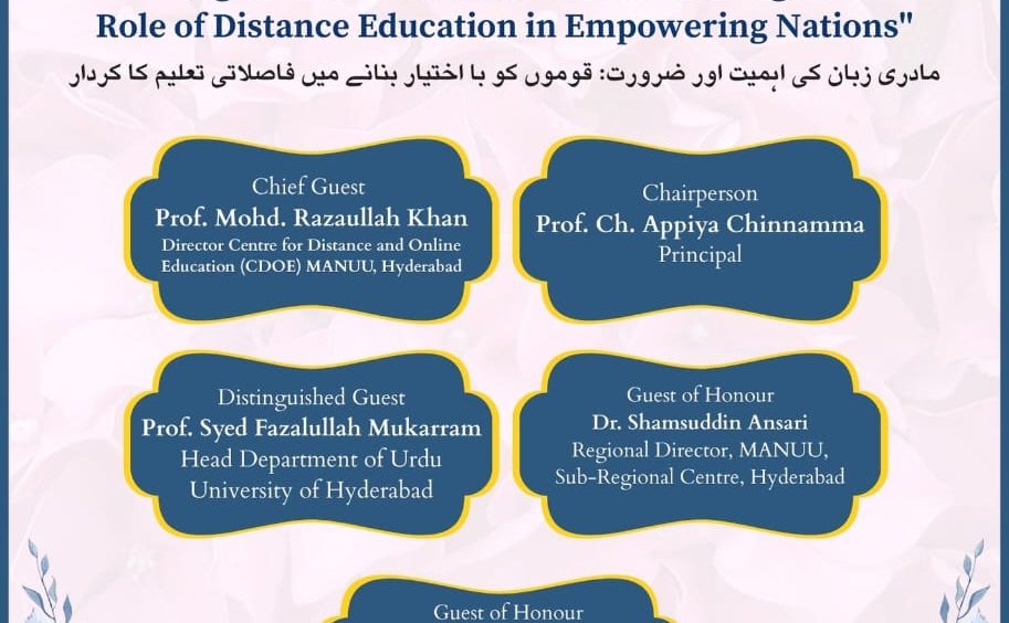 گورنمنٹ ڈگری کالج فار ویمن، حسینی علم، حیدرآباد میں ’’مادری زبان کی اہمیت اور ضرورت: قوموں کو بااختیار بنانے میں فاصلاتی تعلیم کا کردار‘‘ کے عنوان سے یک روزہ ورکشاپ منعقد کی جارہی ہے۔ یہ پروگرام بروز ہفتہ 20 ستمبر 2025 کو لرنر سپورٹ سنٹر (19190)، مولانا آزاد نیشنل اردو یونیورسٹی، حیدرآباد کے اشتراک سے کالج کے خورشید جاہ سیمینار ہال میں صبح 10 بجے منعقد ہوگا۔