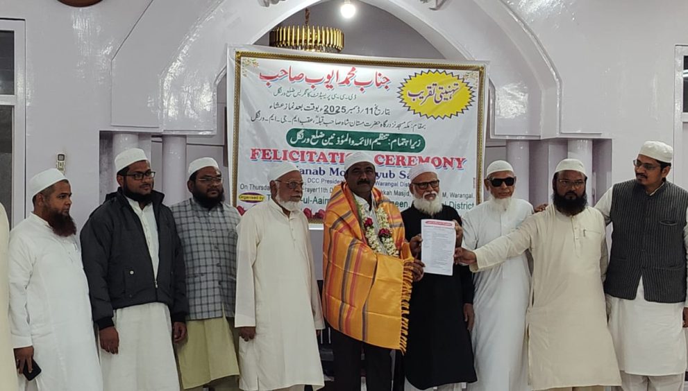 ورنگل۔/12 ڈسمبر (نامہ نگار) تنظیمِ الأئمہ و المؤذنین ضلع ورنگل کے زیراہتمام مکہ مسجد ورنگل میں سینیئر کانگریس قائد محمد ایوب کو صدر ضلع کانگریس کمیٹی نامزد کیے جانے کے اعزاز میں تہنیتی و استقبالیہ اجلاس منعقد ہوا۔ اجلاس کا آغاز خوش الحان طالبِ علم محمد عفان کی دلکش تلاوتِ کلامِ پاک سے ہوا، بعد اذاں اجتماعی دعا کی گئی۔اجلاس کی صدارت حافظ نصیر الدین حسامی نے کی۔ اپنے صدارتی خطاب میں انہوں نے کہا کہ ائمہ کرام صرف نماز کے امام نہیں بلکہ ملت کے رہنما، اخلاقی معلم اور امن و اتحاد کے علمبردار ہیں۔ پروگرام سے مفتی منہاج احمد قیومی، مولانا بلال افضل قاسمی، مولانا منور حسین قاسمی اور دیگر علمائے کرام نے خطاب کرتے ہوئے ائمہ و مؤذنین کے سماجی و اقتصادی مسائل پر روشنی ڈالی اور حکومت سے ان کے لیے فلاحی اقدامات اور مستقل پالیسی وضع کرنے کا مطالبہ کیا۔بعد اذاں تنظیم کے سیکریٹری مولانا سید اعجاز حفیظ اسعدی و رحمانی نے ضلع کانگرس پارٹی صدر محمد ایوب کی گل پوشی وہ شال پوشی کی۔ اس موقع پر محمد ایوب نے خطاب کرتے ہوئے کہا ائمہ و مؤذنین کے مسائل پر ہمدردانہ غور کرتے ہوئے متعدد اہم اعلانات کیے، جن میں ڈبل بیڈروم ہاؤزنگ اسکیم میں ترجیحی منظوری، سرکاری فلاحی اسکیمات میں دینی طبقات کے لیے خصوصی مواقع، اور ائمہ و مؤذنین کی آمدنی میں بہتری کے اقدامات شامل ہیں۔انہوں نے کہا کہ “ائمہ و مؤذنین ہمارے سماج کا روشن چہرہ ہیں، ان کی خدمات ناقابلِ فراموش ہیں، اور ان کے مسائل کا حل میری اولین ترجیح ہے۔”شرکائے اجلاس نے امید ظاہر کی کہ صدر محمد ایوب کے اعلانات جلد عملی شکل اختیار کریں گے، جس سے دینی خدمت گار طبقہ کے حالات میں نمایاں بہتری آئے گی۔ اس موقع پر حافظ نثار احمد،مولانا عرفان ،حافظ صادق حسین، مولوی محمد ریاض الدین ،محمد کرم علی خان کے علاوہ علماء کرام، ائمہ، مؤذنین اور نوجوانوں کی بڑی تعداد شرکت کی۔
