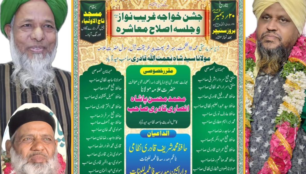 اورنگ آباد، مہاراشٹرا -19 / ڈسمبر ( پریس ریلیز ) حضرت مولانا حافظ مفتی محمد شریف قادری نظامی فارغ التحصیل جامعہ نظامیہ ناظم مدرسہء فاطمہ للبنات کے بموجب الانوارؒ ایجوکیشنل اینڈ ویلفیئر ٹرسٹ کے زیر اہتمام 20 / ڈسمبر بروز ہفتہ بعد نماز عشاء مسجد تاج الاولیاء پٹیل نگر نارے گاؤں ، اورنگ آباد مہاراشٹرا میں عظیم الشان پیمانہ پر سالانہ مرکزی جشنِ خواجہ غریب النوازؓ و جلسہء اصلاح معاشرہ منایا جارہا ہے جس کی سرپرستی شہزادہء جگر گوشہء پیران پیرؓ عمدۃ الحکمت حضرت علامہ الحاج سید شاہ نعمت اللہ قادری جمیع السلاسل مولوی کامل جامعہ نظامیہ ، بانی و مہتمم مدرسہء عربیہ انوارالعلوم ملحقہ جامعہ نظامیہ بھوانی نگر حیدرآباد دکن فرمائینگے – مہمانان خصوصی مفسر قرآن حکیم حضرت علامہ محمد محی الدین قادری محمودی مولوی کامل الحدیث جامعہ نظامیہ و خازن کُل ہند انجمن طلباء قدیم جامعہ نظامیہ اور خطیب اہل سنت بھارت سیوا رتن ایوارڈ یافتہ اسدالعلماء تنویر صحافت مولانا محمد محسن پاشاہ انصاری قادری نقشبندی مجددی مولوی کامل الحدیث جامعہ نظامیہ و جنرل سیکریٹری کُل ہند سنی علماء مشائخ بورڈ محبوب نگر تلنگانہ کا خصوصی اور اہم خطاب ہوگا – میزبان علماء کرام مفتئ مراٹھواڑہ حضرت مولانا مفتی الحاج حافظ شیخ محمد سردار اشرفی الجیلانی قبلہ مولوی کامل جامعہ نظامیہ، حضرت مولانا مفتی محمد اسرار احمد نظامی مولوی کامل جامعہ نظامیہ،حضرت مولانا حافظ محمد رفیق قادری مولوی کامل جامعہ نظامیہ، حضرت مولانا حافظ سید عبدالعلیم نظامی مولوی کامل جامعہ نظامیہ، حضرت حافظ عارف نوری ،جناب محمد ابراھیم عطاری ،جناب محمد ساجد رضا ،حضرت حافظ شیخ عبدالکریم ، حافظ شیخ عمران قادری ، حافظ محمد ھاشم رضا ،مولانا رضوان شطاری نظامی ،حافظ شیخ اسماعیل قادری ،حافظ شیخ محمود ، حافظ اسماعیل نقشبندی، حافظ محمد اختر قادری ، حافظ شیخ سرفراز ، حافظ سید آصف ، مولوی محمد خان ،حافظ واجد رضا خان ،قاری محمد انوار اللہ مولوی نذیر قادری ،مولوی سید اظہر قادری ، مولوی عبدالحنان ، حافظ شیخ ریاض قادری اور حافظ غلام غوث ہونگے – شمعء محمدیؐ کے پروانوں غوثؓ و خواجہؓ کے دیوانوں سے شرکت کی پرخلوص خواہش کی جاتی ہے-