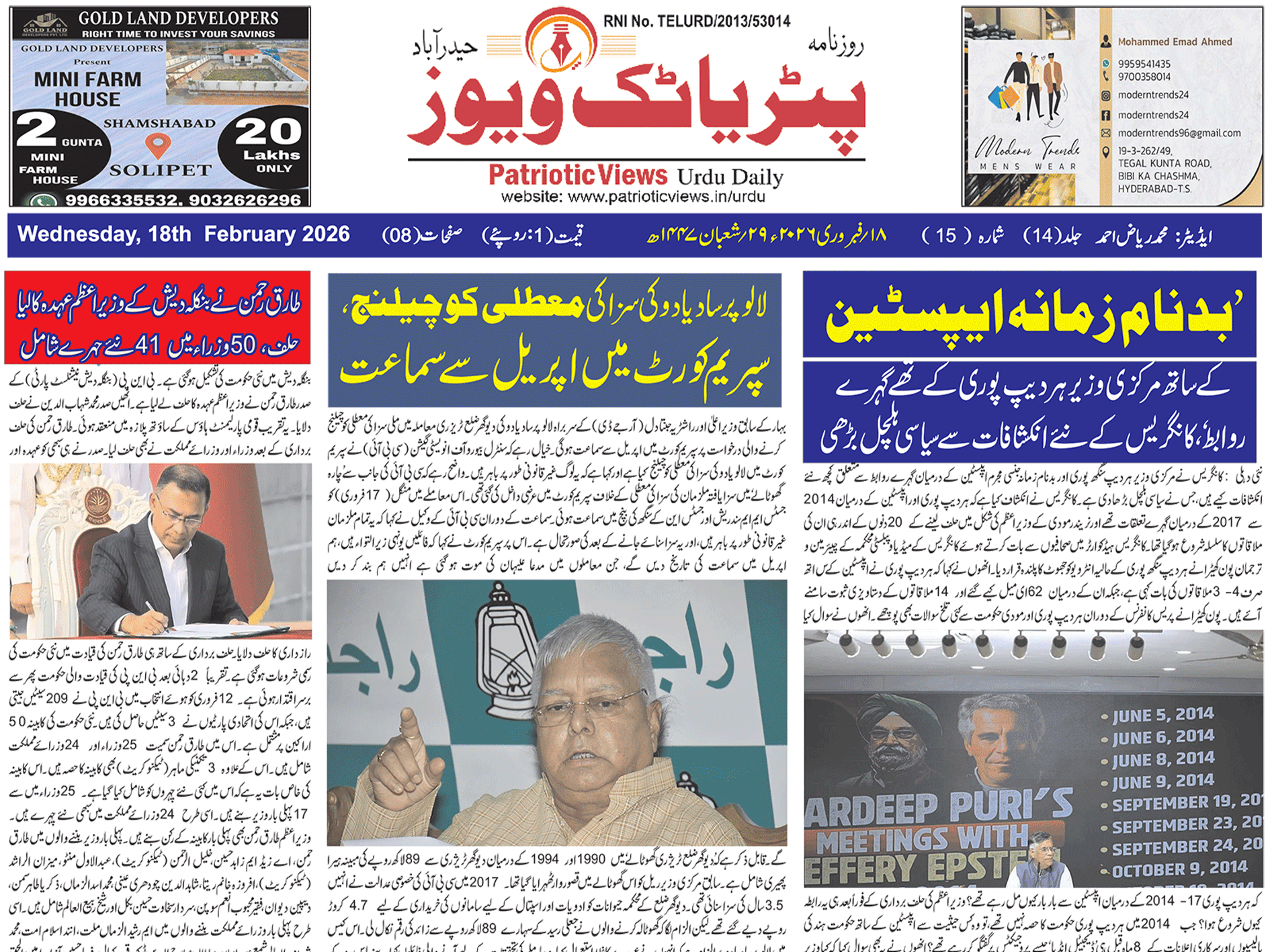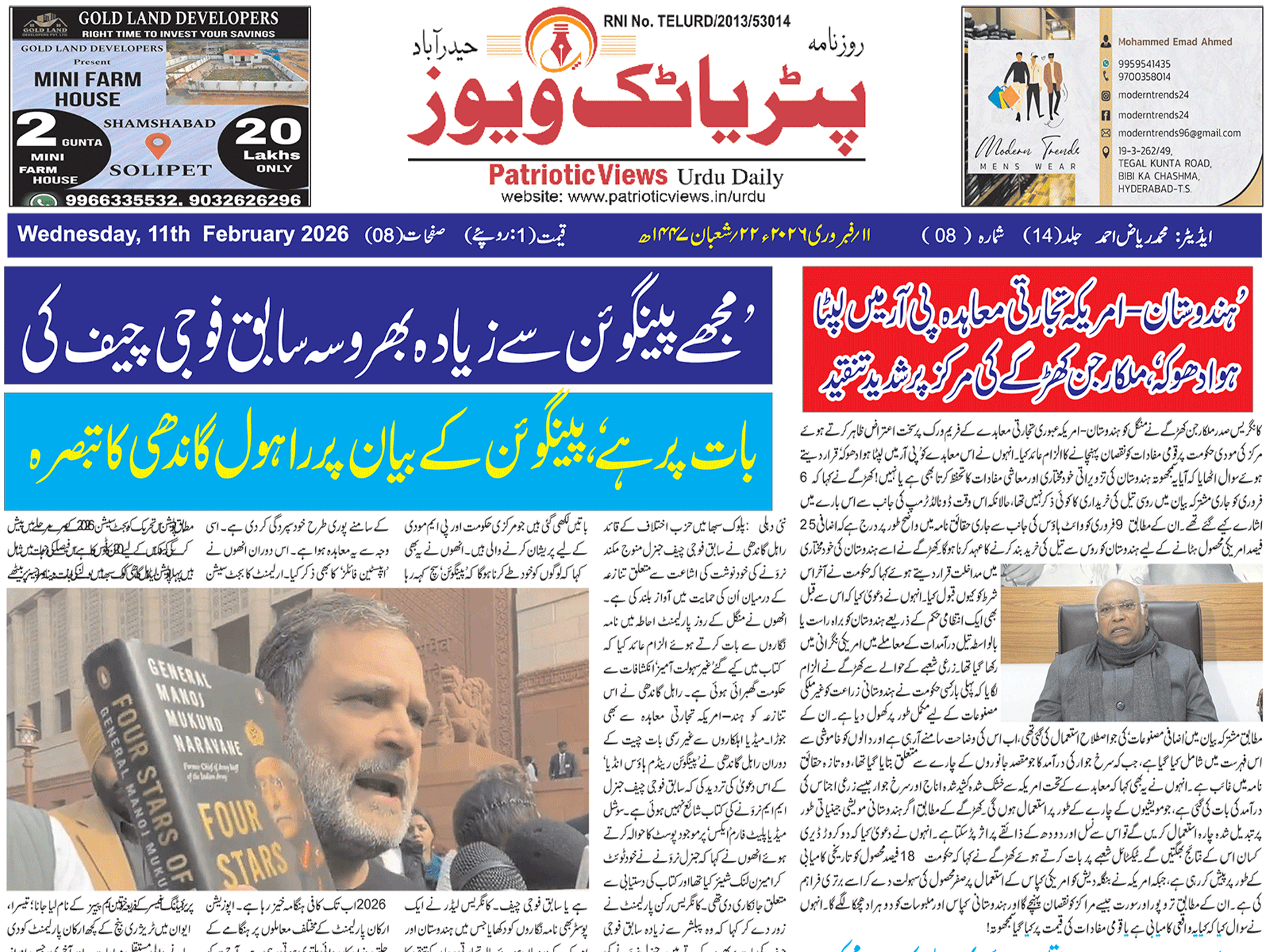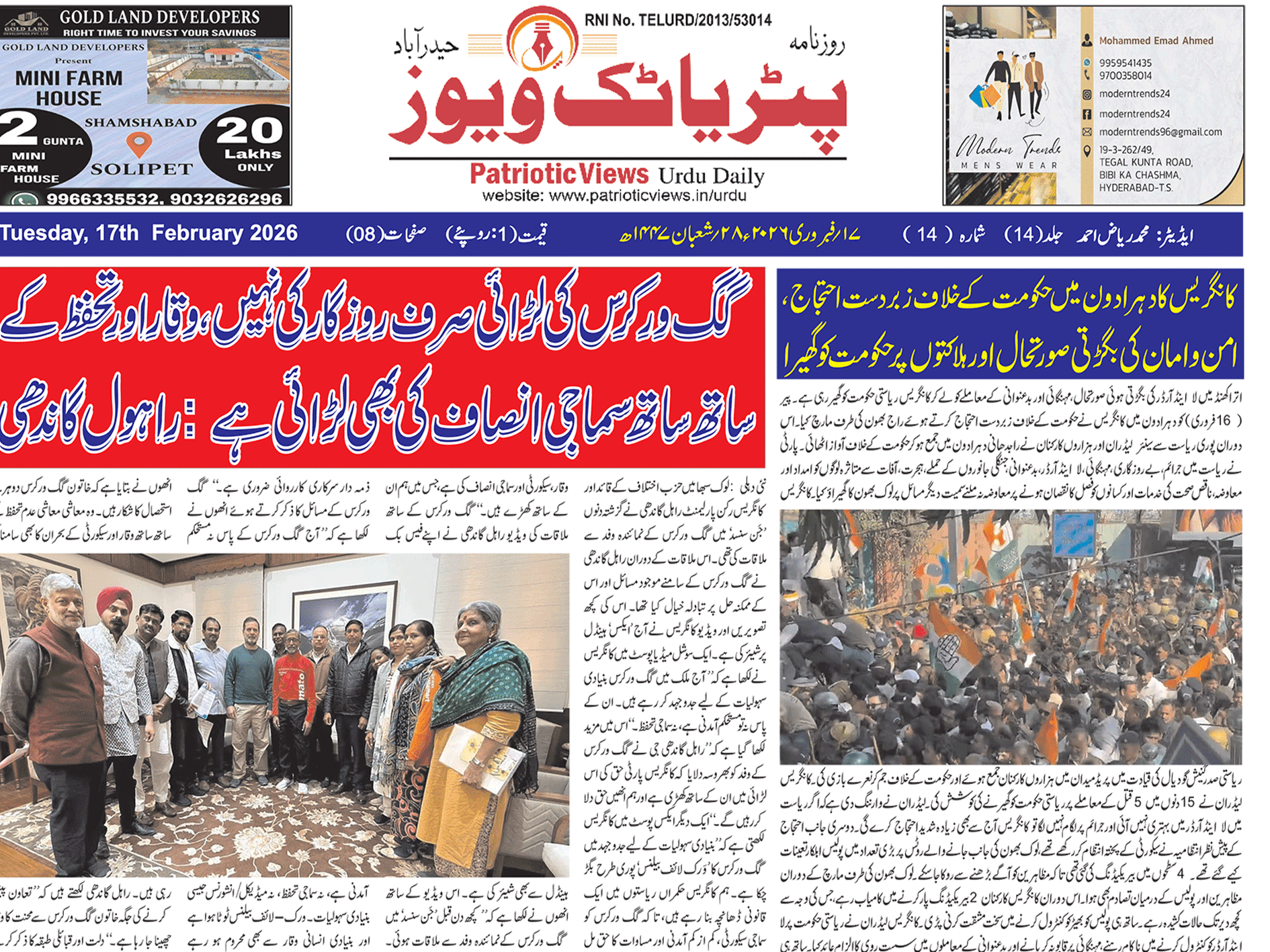 #اردو روزنامہ تلنگانہ کے جہد کاروں اور شہداءکے خاندانوں کے ساتھ تاحال انصاف نہیں ہوا کانگریس حکومت تمام وعدوں کو پورا کرے۔بجٹ میں خاطر خواہ اورواضح گنجائش فراہم کی جائے تلنگانہ جاگروتی اپنی جدوجہد جاری Patriotic Views / 2 مہینے Comment (0) (49)