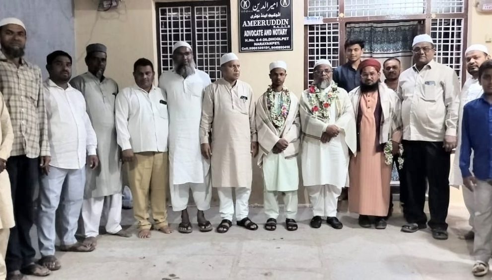 نارائن پیٹ: مدر سہ دارالعلوم دینیہ جامع مسجد نارائن پیٹ ملحقہ جامعہ نظامیہ کے ہونہار طالب علم محمد جعفر الدین ولد محمد خواجہ کو ریاستی سطح کا اعلیٰ عظیم الشان انعام اول عمرہ ٹکٹ عطا ہونے پر جناب امیر الدین ایڈوکیٹ کی رہائش گاہ میں ہونہار طالب علم کی تہنیتی تقریب منعقد ہوئی۔ تقریب کی صدارت سید شاہ غیاث الدین قادری سجادہ نشین بارگاہ تقی بابا رح نے کی۔ اس موقع پر حافظ محمد جعفر الدین کو تہینت پیش کی گئی۔ اس موقع پر محمد عظیم مڑکی’ محمد عقیل چاند’ محمد تقی چاند’ اعجاز مڑکی’ شہاب الدین چاند’ محمد تقی موذن’ حسن الدین مسعودی’ دلدار موذن’ ایوب ٹیچر’ محمد عارف انپور’ شرف الدین رنگریز’ ودیگر موجود تھے۔ مولانا فاروق بن مخاشن نے دعا کی۔ محمد غوث انپور’ نے مہمانوں کا استقبال کیا۔ اور شکریہ ادا کیا۔