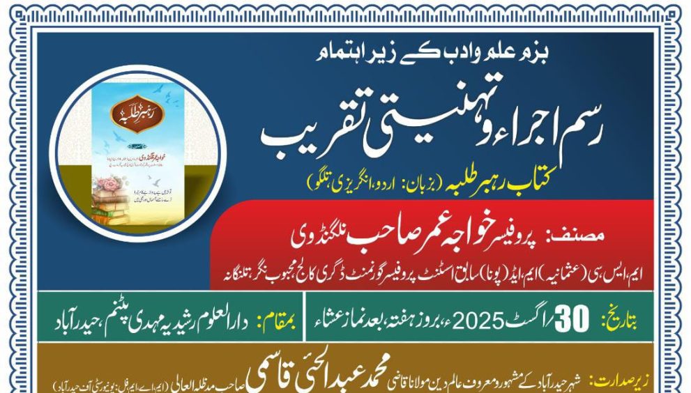 حافظ و مولوی محمد ادریس مصباحی جنرل سیکریٹری بزم حسان بن ثابت رض نعتیہ کمیٹی حیدرآباد تلنگانہ کی اطلاع کے بموجب بتاریخ 30 اگسٹ بروز ہفتہ بعد نماز عشاء بمقام دارالعلوم رشیدیہ مہدی پٹنم حیدرآباد میں بزم علم و ادب کے زیر اہتمام ایک اجلاس بعنوان ” رسم اجراء و تہنیتی تقریب کتاب رہبر طلبہ مصنف الحاج پروفیسر مولوی خواجہ عمر صاحب مدظلہ العالی نلگنڈوی منعقد ہے جس کی صدارت شہر حیدرآباد کے مشہور و معروف عالم دین حضرت مولانا قاضی محمد عبد الحئی صاحب قاسمی مدظلہ العالی ۔ایم اے ایم فل یونیورسٹی آف حیدرآباد تلنگانہ کریں گے اور عالمی شہرت یافتہ قاری قرآن خطیب شیریں بیاں حضرت مولانا ڈاکٹر محمد نصیر الدین منشاوی صاحب مدظلہ العالی استاد شعبہ اردو آرٹس کالج عثمانیہ یونیورسٹی حیدرآباد فرمائیں گے ان کے علاوہ مہمان مقررین رئیس القلم شیخ العرب والعجم پروفیسر حضرت مولانا ڈاکٹر سید جہانگیر صاحب حفظہ اللہ بانی و مہتمم الحرمین الشریفین عربی و انگلش دانش گاہ انٹرنیشنل یونیورسٹی نزد عثمانیہ یونیورسٹی تارناکہ ، سکندر آباد حیدرآباد نوجوان عالم دین خطیب باکمال داعئی کبیر حضرت مولانا مفتی احمد اللہ نثار صاحب قاسمی دامت برکاتہم العالیہ خلیفہ مجاز محبوب العلماء والصلحاء حضرت مولانا پیر ذوالفقار احمد صاحب نقشبندی دامت برکاتہم العالیہ و مہتمم دار العلوم رشیدیہ مہدی پٹنم حیدرآباد اور شہر محبوب نگر کی معزز شخصیت بافیض عالم دین حضرت مولانا مفتی عبداللہ حامد صاحب رشادی چشتی قادری مدظلہ خلیفہ مجاز استاذ الاساتذہ پیر طریقت حضرت مولانا اظہار الحق صاحب قریشی صابری دامت برکاتہم و مہتمم جامعہ اسلامیہ تعلیم البنات ٹرسٹ محبوب نگر تلنگانہ و خادم الحجاج حضرت مولانا مفتی سید آصف الدین ندوی قاسمی ایم اے ڈائریکٹر انسٹی ٹیوٹ آف عربک حیدرآباد کے قیمتی خطابات ہوں گے-محبان اردو سے التماس کی ہے کہ وہ بوقت پابندی شرکت فرمائیں ۔
