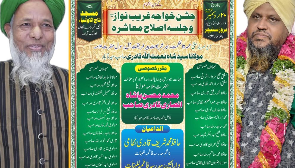 نظامیہ ناظم مدرسہء فاطمہ للبنات نے اپنے ایک صحافتی کانفرنس سے خطاب کرتے ہوئے کہاکہ الانوار ایجوکیشنل اینڈ ویلفیئر ٹرسٹ کے زیر اہتمام 20 / ڈسمبر بروز ہفتہ بعد نماز عشاء مسجد تاج الاولیاء پٹیل نگر نارے گاؤں ،اورنگ آباد مہاراشٹرا میں عظیم الشان پیمانہ پر سالانہ مرکزی جشنِ خواجہ غریب النوازؓ و جلسہء اصلاح معاشرہ منایا جارہا ہے جس کی سرپرستی شہزادہء جگر گوشہء پیران پیرؓ عمدۃ الحکمت حضرت علامہ الحاج سید شاہ نعمت اللہ قادری جمیع السلاسل بانی و مہتمم مدرسہء عربیہ انوارالعلوم ملحقہ جامعہ نظامیہ بھوانی نگر حیدرآباد دکن فرمائینگے – مہمان خصوصی خطیب اہل سنت بھارت سیوا رتن ایوارڈ یافتہ اسدالعلماء تنویر صحافت مولانا محمد محسن پاشاہ انصاری قادری نقشبندی مجددی مولوی کامل الحدیث جامعہ نظامیہ و جنرل سیکریٹری کُل ہند سنی علماء مشائخ بورڈ محبوب نگر تلنگانہ کا خصوصی اور اہم خطاب ہوگا – مہمان علماء کرام مفتئ مراٹھواڑہ حضرت مولانا الحاج حافظ شیخ محمد سردار اشرفی الجیلانی قبلہ ، حضرت مولانا مفتی محمد اسرار احمد نظامی ،حضرت مولانا حافظ محمد رفیق قادری ،حضرت مولانا حافظ سید عبدالعلیم نظامی ، حضرت حافظ عارف نوری ،جناب محمد ابراھیم عطاری ،جناب محمد ساجد رضا ،حضرت حافظ شیخ عبدالکریم ،حافظ شیخ عمران قادری ، حافظ محمد ھاشم رضا ،مولانا رضوان شطاری نظامی ،حافظ شیخ اسماعیل قادری ،حافظ شیخ محمود ، حافظ اسماعیل نقشبندی، حافظ محمد اختر قادری ، حافظ شیخ سرفراز ، حافظ سید آصف ، مولوی محمد خان ،حافظ واجد رضا خان ،قاری محمد انوار اللہ مولوی نذیر قادری ،مولوی سید اظہر قادری ، مولوی عبدالحنان ، حافظ شیخ ریاض قادری اور حافظ غلام غوث ہونگے – شمعء محمدیؐ کے پروانوں غوثؓ و خواجہؓ کے دیوانوں سے شرکت کی پرخلوص خواہش کی جاتی ہے