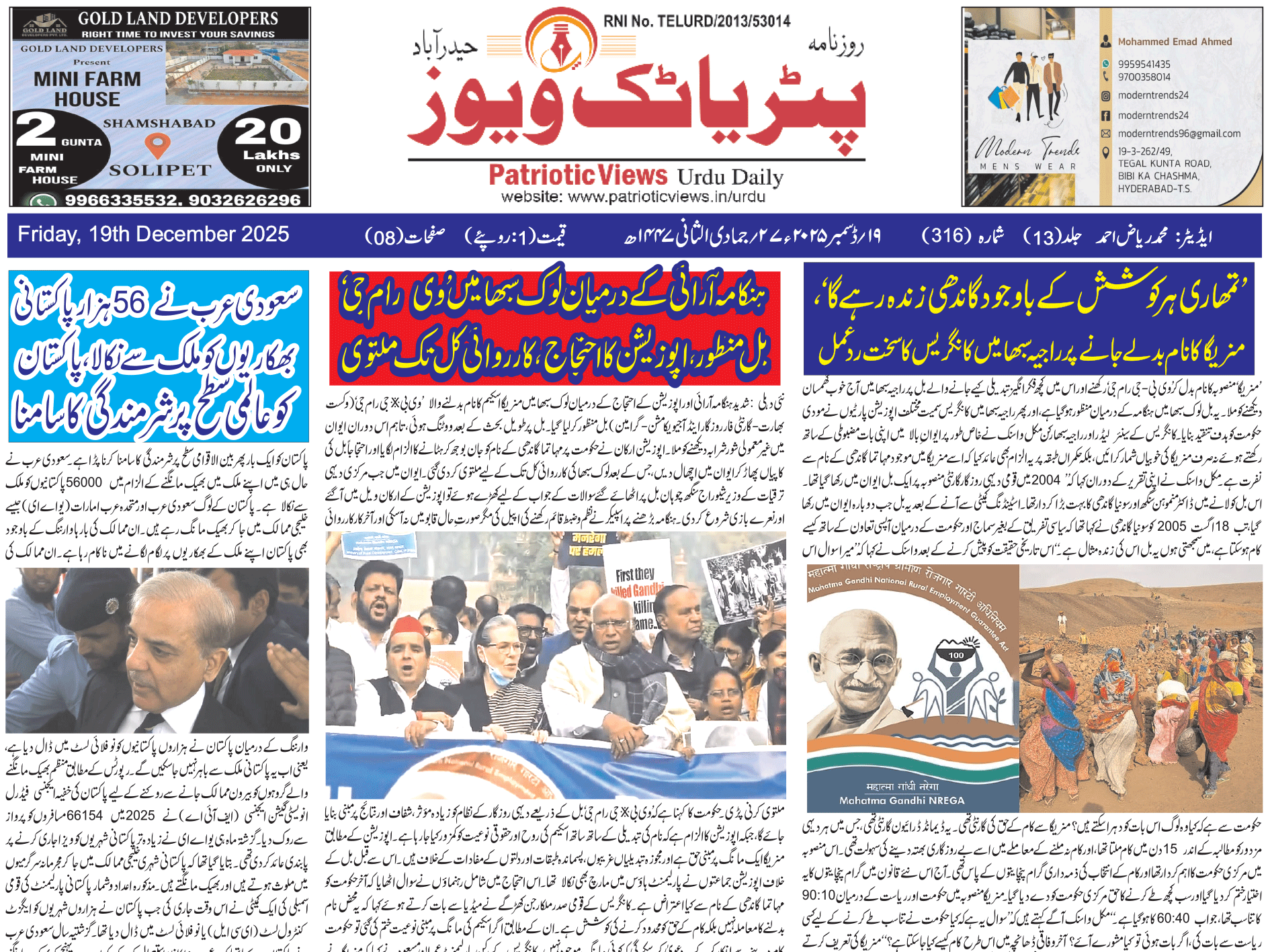 #تلنگانہ کرناٹک کی طرح تلنگانہ میں بھی ہیٹ کرائم کیخلاف قانون سازی کا مطالبہتلنگانہ کانگریس حکومت، جمعیت علماء کی نمائندگی پر منشور میں شامل اپنا وعدہ وفا کرے حیدرـآباد۔20ڈسمبر(پریس نوٹ)کرناٹک اسمبلی میں نفرت انگیز تقاریر اور نفرت پر مبنی جرائم کی روک تھام کیلئے ’’ہیٹ اسپیچ اور ہیٹ کرائم Patriotic Views / 3 ہفتے Comment (0) (18)