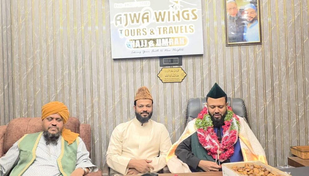 حیدرآباد-17 / ڈسمبر ( اسٹیٹ سماچار ) امریکہ میں مقیم شہزادہء جگر گوشہء پیران پیرؓ نبیرہء جلالۃ العلم سجادہ نشین بدر ملتؒ رہبرراہ شریعت پیر طریقت حضرت مولانا الحاج سید شاہ نجم الدین جیلانی المعروف بہ ثاقب پاشاہ قادری صدر کل ہند سنی علماء بورڈ،بانی و کو چیرمین امریکن اسلامک سوسائٹی امریکہ نے آج 17 / ڈسمبر بروز چہارشنبہ بعد نماز مغرب اجواء وینگس ٹورس اینڈ ٹراویلس حج اور عمرہ، دکن بٹن فیکٹری حسینی علم روڈ حیدرآباد دکن کا تفصیلی دورہ کیا اور کہاکہ شُہرہء آفاق جامعہ نظامیہ کے عظیم سپوت بھارت سیوارتن ایوارڈ یافتہ اسدالعلماء تنویر صحافت مولانا محمد محسن پاشاہ انصاری قادری نقشبندی مجددی مولوی کامل الحدیث جامعہ نظامیہ و جنرل سیکریٹری کُل ہند سنی علماء مشائخ بورڈ کی سرپرستی اور پروپرائیٹر اجواء وینگس ٹورس اینڈ ٹراویلس حج وعمرہ گروپ خنجر مولائے کائنات حضرت علامہ الحاج مفتی محمد خالد محی الدین قادری نقشبندی چشتی سہروردی جمیع السلاسل مولوی کامل الحدیث جامعہ نظامیہ حیدرآباد کی راست نگرانی میں پچھلے 15 / سال سے جاری خدمات لائق صد تحسین ہے الحمد للہ رب اللعٰلمین جامعہ نظامیہ کے فارغین کی خدمات سے حج و عمرہ زائرین مطمئن ہیں ،مولانا جیلانی نے یہ بھی کہاکہ مسلمانوں کو چاہیئے کہ وہ بھی اجواء وینگس ٹورس اینڈ ٹراویلس کی خدمات سے بھرپور استفادہ کرنا چاہیئے چونکہ مستند علماء کرام کی نگرانی میں بآسانی حج و عمرہ کی سعادت پرودگار عالم کی جانب سے نعمت غیر مترقبہ ہے-اجواء وینگس پروپرائیٹر حضرت مولانا الحاج مفتی محمد خالد محی الدین قادری مولوی کامل جامعہ نظامیہ نے کہاکہ ہمارے ٹراویلس کی سرپرستی آغاز سے ہی اسدالعلماء تنویر صحافت مولانا محمد محسن پاشاہ انصاری قادری نقشبندی مجددی مولوی کامل الحدیث جامعہ نظامیہ کی سرپرستی حاصل ہے ، ہم جانشین بدر ملتؒ کے بے حد ممنون ہیں کہ جنہوں نے اپنی گونا گوں مصروفیات کے باوجود ہمارے دفتر تشریف لاکر ہمارے لئے دعائیں فرمائیں اور ہمت افزائی بھی کی- اسدالعلماء تنویر صحافت مولانا محمد محسن پاشاہ انصاری قادری نقشبندی مجددی مولوی کامل الحدیث جامعہ نظامیہ و سرپرست اجواء حج وعمرہ ٹراویلس نے کہاکہ ہمارے مقصد ملت اسلامیہ کی خاموش اور ٹھوس خدمات انجام دینا ہے اور انکی دعاوؤں کی اشد ضرورت ہے -اس موقعہ پر مولانا حافظ محمد قطب الرحمٰن افتخاری سنگاریڈی ،مولوی محمد سرفراز خان بانی و صدر کل ہند بزم غلامان مصطفیٰؐ کمیٹی ، مولوی محمد معین مازن انصاری ، جناب محمد جاوید قادری و دیگر حضرات موجود تھے –