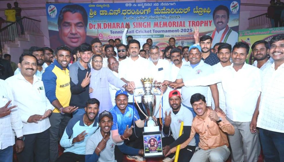 بیدر25 ڈسمبر(نامہ نگار) بیدر کے نہرو اسٹیڈیم میں سابق وزیر اعلیٰ این دھرم سنگھ کی یاد میں دھرم سنگھ نواں کرکٹ ٹرافی ٹورنامنٹ کا انعقاد کیا گیا۔کل بدھ(چہارشنبہ) کو ہونے والے فائنل میچ میں بگدل کرکٹ کلب ٹیم نے HKGN چٹہ کرکٹ کلب کی ٹیم کو شکست دے کر ٹرافی اپنے نام کی۔ ایچ کے جی این چٹہ کرکٹ کلب کی ٹیم رنر اپ پوزیشن سے مطمئن رہی۔ ایچ کے جی این چٹہ کرکٹ کلب کی ٹیم نے پہلے بیٹنگ کرتے ہوئے مقررہ وقت میں تین وکٹوں کے نقصان پر 113 رنز بنائے۔10 اوورز اگلی بیٹنگ کرتے ہوئے بگدل کرکٹ کلب کی ٹیم نے مقررہ وقت میں تین وکٹوں کے نقصان پر9اوورمیں 117 رنز بنائے اورٹورنمنٹ جیت گئے۔جیتنے والی ٹیم نے ایک لاکھ روپے نقد اورٹرافی جیت لی۔ رنر اپ ٹیم نے 50,000 روپئے نقد اور ٹرافی حاصل کی۔ سچن ڈگے کو مین آف دی سیریز اور بہترین بلے باز اور سید اظہر کو بہترین باؤلر کا ایوارڈ دیا گیا۔ اس ٹورنامنٹ میں بیدر جنوب اسمبلی حلقہ کی 32 کرکٹ ٹیموں نے حصہ لیا۔ ٹورنامنٹ کی اختتامی تقریب میں ٹورنامنٹ کے آرگنائزر چندر سنگھ نے فاتح اور رنر اپ ٹیموں کو ٹرافیاں، نقد انعامات اور دیگرانعامات پیش کیے۔ ممتازقائدین میں یوسف علی جمعدار، این اے قادری، نارائن راؤ بھنگی، سرینواس ریڈی، رشید پٹیل، فصیح پٹیل، پربھاوتی، لکشمی، مہنتیش ریکلگی، امیش شاہ پور، ناگ شٹی آرکی، شیوکمار منااکھیلی، غفورصاب چٹہ، ماروتی ماسٹر، ناظم پٹیل، ناصرقادری اور دیگر شامل تھے۔۔۔